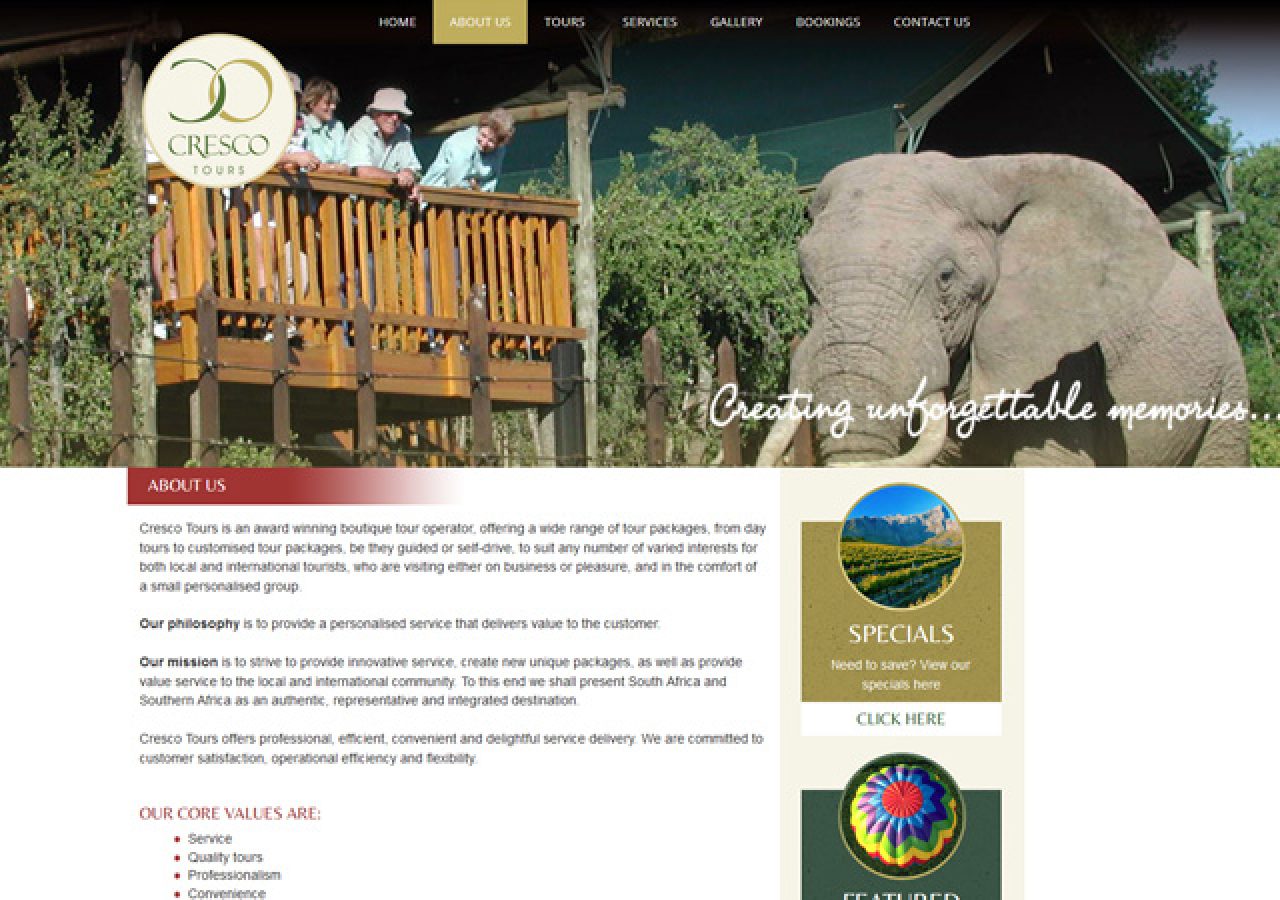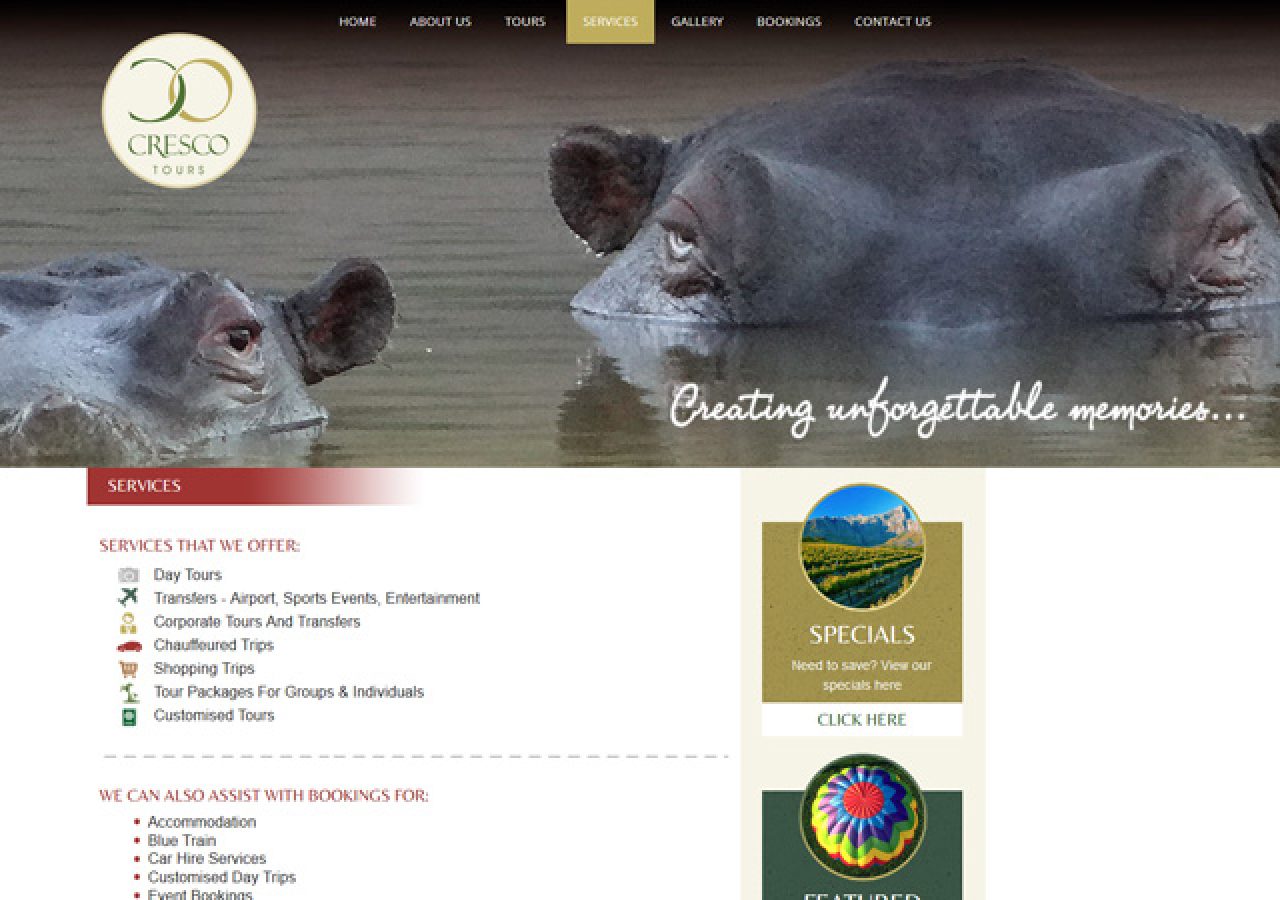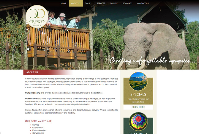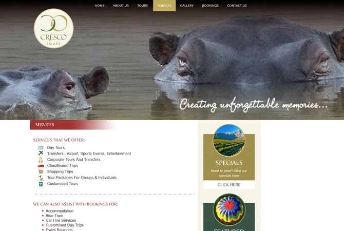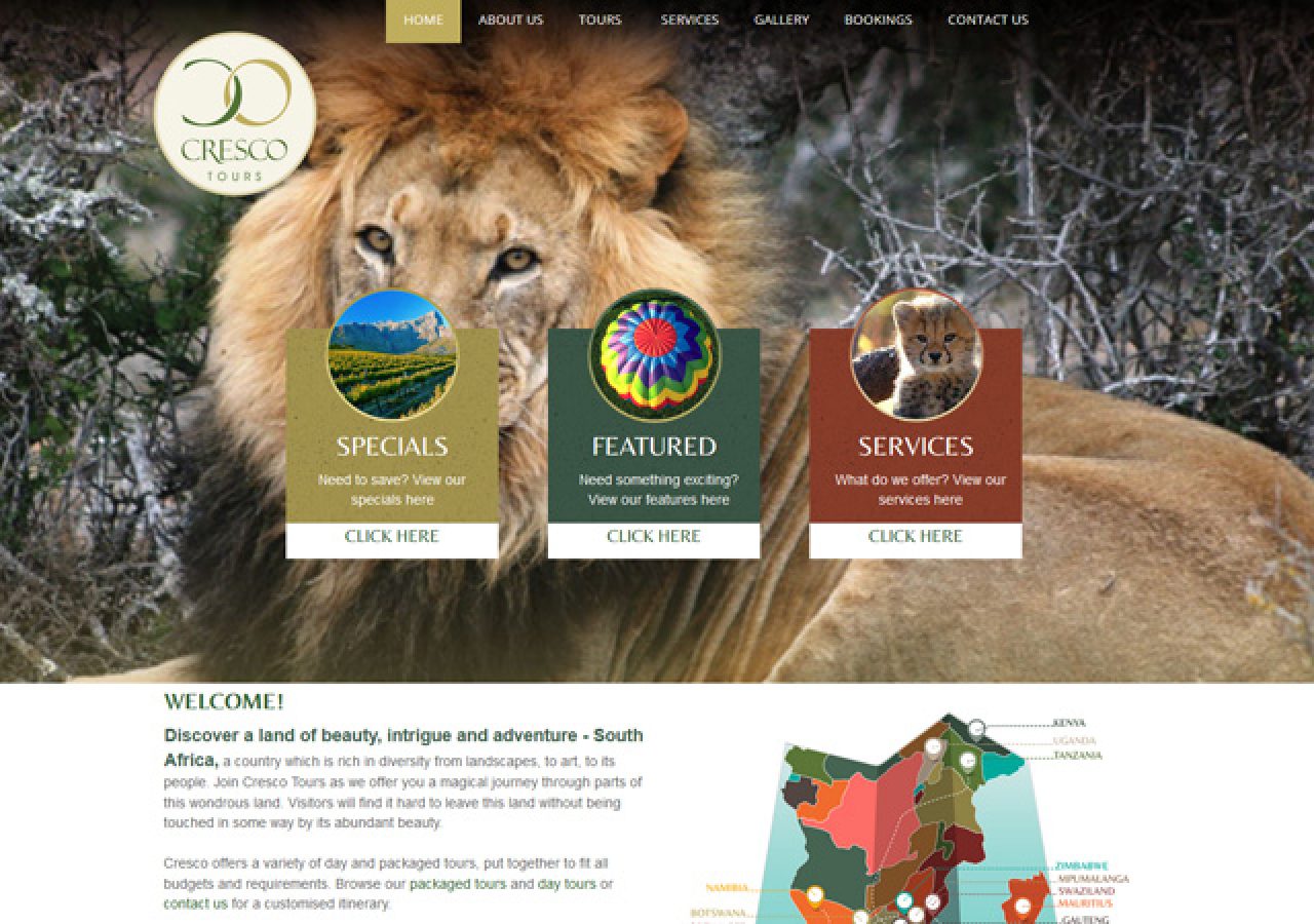 Custom designed responsive website design implementing a customized look and feel. Redesign incorporating large images of wildflife and tours.